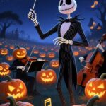 Witness the spectacle of the Pumpkin King, Jack Skellington, in his element, leading a spooky, musical Halloween event. This dramatic wallpaper features Jack as a maestro, conducting a macabre orchestra with musicians whose heads are glowing pumpkins, all set within a massive field of jack-o’-lanterns. The crescent moon casts a beautiful glow over the eerie and musical scene, making this a perfect Halloween-themed wallpaper for any device.