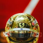 Experience the glamour and speed of Formula 1 with this high-resolution photo of a brilliant gold Ferrari racing helmet. The glossy, reflective gold contrasts sharply with the bold Scuderia Ferrari red background, creating a visually stunning effect. Covered in sponsor logos and featuring the iconic Ferrari badge, this motorsport wallpaper captures the luxury and precision of F1 racing, making it the perfect screen background for any Tifosi or racing fan.