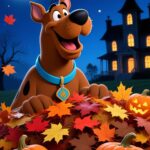 Zoinks! This cheerful Halloween wallpaper features everyone’s favorite scaredy-dog, Scooby-Doo, having a blast as he dives into a pile of brightly colored autumn leaves. He’s flanked by smiling jack-o’-lanterns and a distant, spooky mansion under the moonlight. This vibrant illustration perfectly captures the spirit of both fall and fun, classic Scooby-Doo adventures.