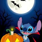 Get ready for a dose of cute terror with this Halloween wallpaper! The lovable alien Stitch from Disney’s Lilo & Stitch is dressed up as a miniature Dracula, complete with a cape and fangs. He’s cheerfully posing next to a glowing jack-o’-lantern under a massive full moon with bats silhouetted in the night sky. This charming illustration is a delightful blend of spooky season fun and beloved Disney character art.