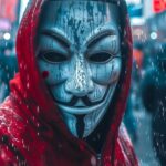 This intense wallpaper features the iconic Guy Fawkes mask, popularly associated with V for Vendetta and the hacktivist group Anonymous. The figure is wearing a striking red hoodie and is set against a blurry, dark urban city street backdrop, possibly Times Square, with falling snow or rain. The mask, with its stylized smile and red cheek dots, stands out dramatically against the deep red and dark urban blues. It’s a powerful statement piece for themes of protest, hacking, and political revolution. Type: Digital/AI Art (Likely based on the Anonymous/Guy Fawkes Mask concept).