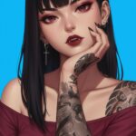 An alluring and moody digital art wallpaper featuring a beautiful gothic-style girl with striking red eyes and subtle vampire fangs. Her dark, sweeping tattoos and black fingernails create a powerful contrast with the deep-red off-shoulder top and the bright blue background. This high-quality artwork is the perfect phone wallpaper for anyone drawn to the dark aesthetic, occult, or vampire themes. She looks both dangerous and captivating! 🧛‍♀️💙