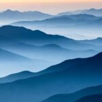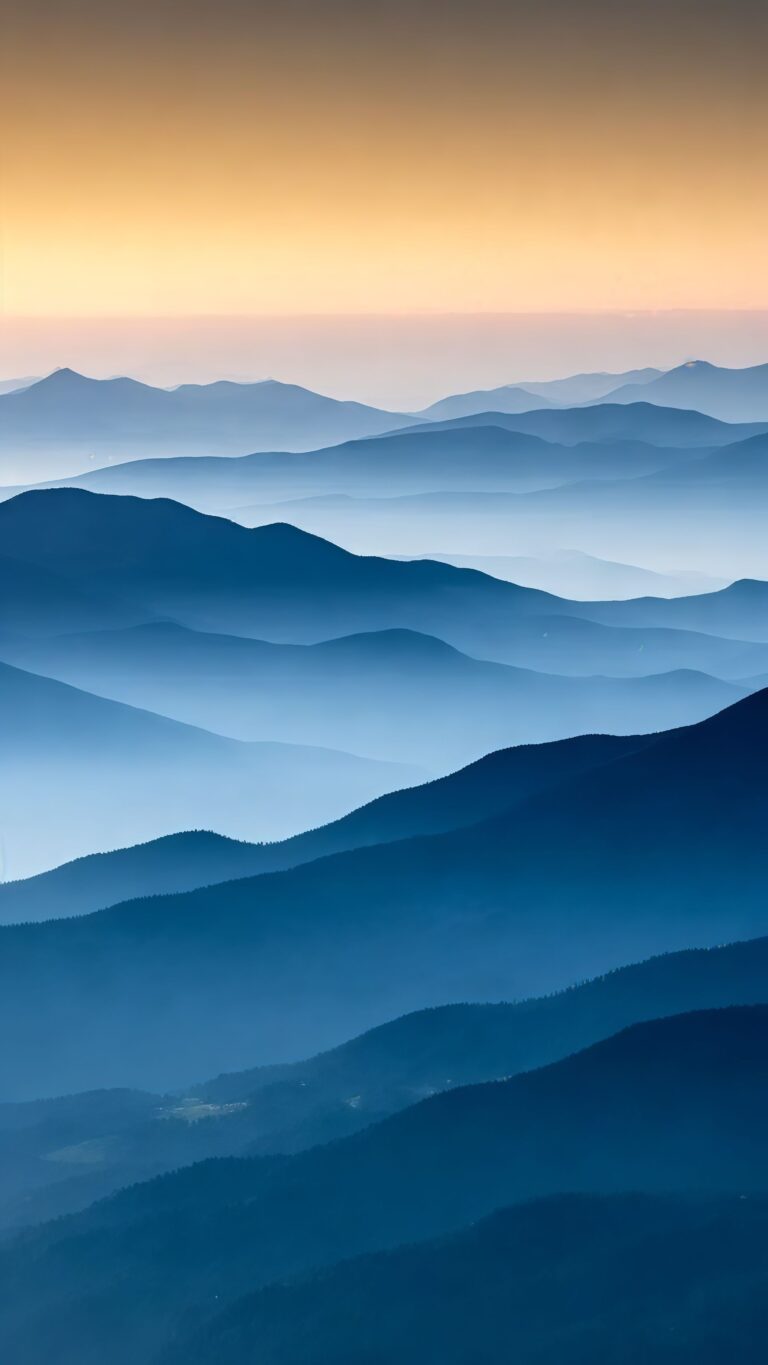 This stunning landscape wallpaper utilizes atmospheric perspective to create an incredible depth of field. Successive layers of mountain peaks are rendered in increasingly lighter, desaturated shades of deep blue, beautifully conveying the sense of vast distance and cool mist. The very top of the image is bathed in a warm, ethereal orange and yellow glow, suggesting the first moments of sunrise or the last moments of sunset. It’s a tranquil and abstract interpretation of a natural scene, perfect for an aesthetically pleasing mobile background that promotes calm and reflection. The color palette is both dramatic and soothing. Tranquility and Depth!
