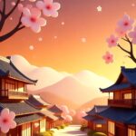 This lovely wallpaper captures the essence of a tranquil spring sunset in a stylized, Japanese setting. The entire scene is rendered in a soft, 3D cartoon style, featuring traditional wooden houses and dark-tiled roofs lining a gentle path. The warm, gradient sunset sky transitions from a soft orange to a pale pink, complementing the large, stylized cherry blossoms (sakura) that float gently through the air and adorn the trees. The overall feeling is one of peace and whimsical beauty, reminiscent of animated feature films. It’s an incredibly warm and inviting wallpaper that brings a touch of spring and Japanese culture to your device. Sweetness and Serenity!