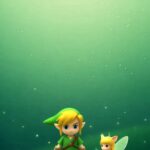A charming and vibrant wallpaper featuring a stylized, youthful Link holding his sword, accompanied by his glowing fairy companion, Navi, against a bright, magical green forest backdrop. A perfect tribute to The Legend of Zelda’s adventurous spirit.