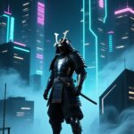 An epic cyberpunk vision featuring a futuristic samurai in full traditional armor, standing on a rooftop against a backdrop of towering, neon-lit skyscrapers in a misty night city. This striking wallpaper blends ancient warrior tradition with a high-tech future aesthetic.