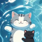 This Adorable Cartoon Cats Floating on Water Wallpaper is pure joy and relaxation. The charming illustration shows two happy cats—a larger grey striped cat and a small black kitten—floating peacefully on their backs in wonderfully clear, shimmering blue water. Their contented smiles perfectly capture a moment of pure, sunlit bliss, making this a delightfully cute and refreshing wallpaper.