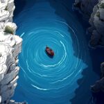 This Deep Blue Water Grotto Cliff Boat Wallpaper offers a calming yet mysterious view into a hidden natural space. The stylized illustration shows a tiny red boat floating in the center of an intensely deep blue pool. The water is so clear, and the ripples so perfectly formed, that it feels otherworldly. Towering white and grey cliffs frame the scene, making the little boat appear peacefully isolated in its spectacular grotto. 🌊🛶