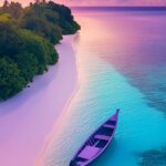 The gorgeous Purple Boat Pink Sunset Tropical Beach Wallpaper depicts a breathtaking, serene tropical scene at dawn or dusk. A sleek purple boat rests gently on the luminous, shallow water, which transitions from pink near the white sand to a vivid teal blue in the distance. The sky is a stunning gradient of magenta, pink, and orange, casting a beautiful glow over the lush green island foliage. This idyllic image is the perfect tranquil aesthetic for a phone wallpaper. 🌅🏖️