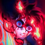 A dramatic, high-contrast wallpaper featuring the fierce Tanjiro Kamado character from Demon Slayer, wreathed in blazing red and yellow flames, with intense blue eyes and a determined expression. Perfect for anime fans who love action and fiery aesthetics.