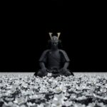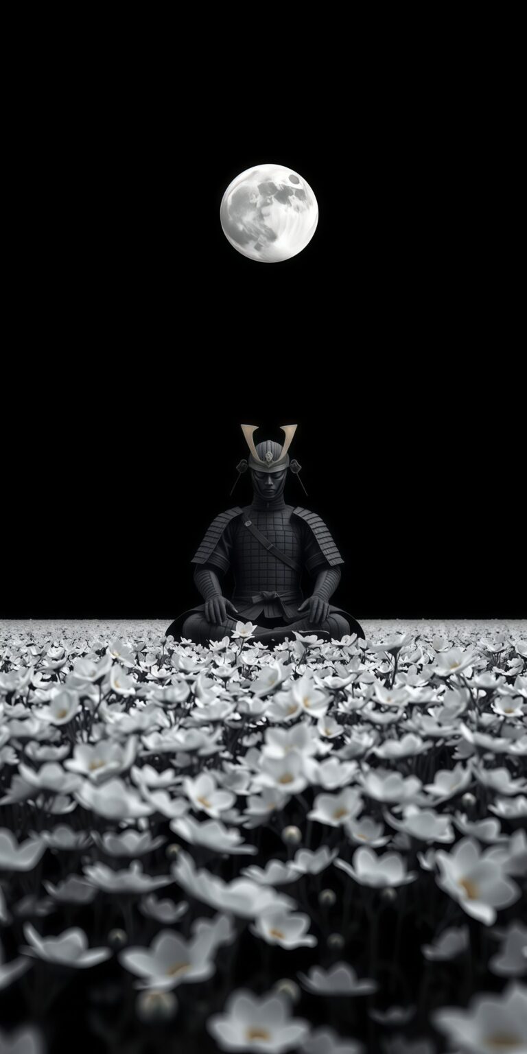 The Samurai Meditation Moonlight Flower Field Wallpaper is a stunning blend of power and tranquility. A dark, imposing samurai warrior in armor sits in a meditative pose amidst an endless field of brilliant white flowers. The scene is dramatically lit by a huge, luminous full moon set against an absolute black sky. This highly monochromatic digital artwork evokes a deep sense of discipline, peace, and beautiful isolation.