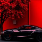 The sophisticated Sleek Black Sports Car Red Aesthetic Night Wallpaper captures an intense, moody scene. A beautiful, low-profile black sports car is parked in the shadows, its dark paint contrasting sharply with the brilliant, monochrome red background. The vibrant red of the wall is complemented by a nearby tree whose leaves are a matching, fiery shade. This high-contrast, minimalist, and modern automotive wallpaper is perfect for car enthusiasts who love a powerful dark aesthetic.