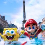 The thrilling SpongeBob and Mario Racing in Paris Wallpaper captures a high-energy, fun-filled sprint as the beloved characters race neck-and-neck through bright blue water. SpongeBob SquarePants and Super Mario are cheering and splashing, with the famous Eiffel Tower looming magnificently in the background of a sunny blue sky in Paris. The vibrant red and yellow colors of the characters contrast perfectly with the cool blue of the water and sky, making this a dynamic and joyful phone wallpaper.