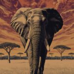 This Majestic African Elephant Savannah Sunset Illustration Wallpaper depicts a grand African elephant with a richly textured, almost sketched appearance, emphasizing the wrinkles of its skin and its imposing size. The warm, earthy tones of the dry savannah grass and the dramatic, fiery orange and brown colors of the sunset sky create an evocative, powerful scene of African wildlife. It’s a striking and awe-inspiring nature wallpaper for fans of the animal kingdom. 🐘🌅