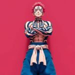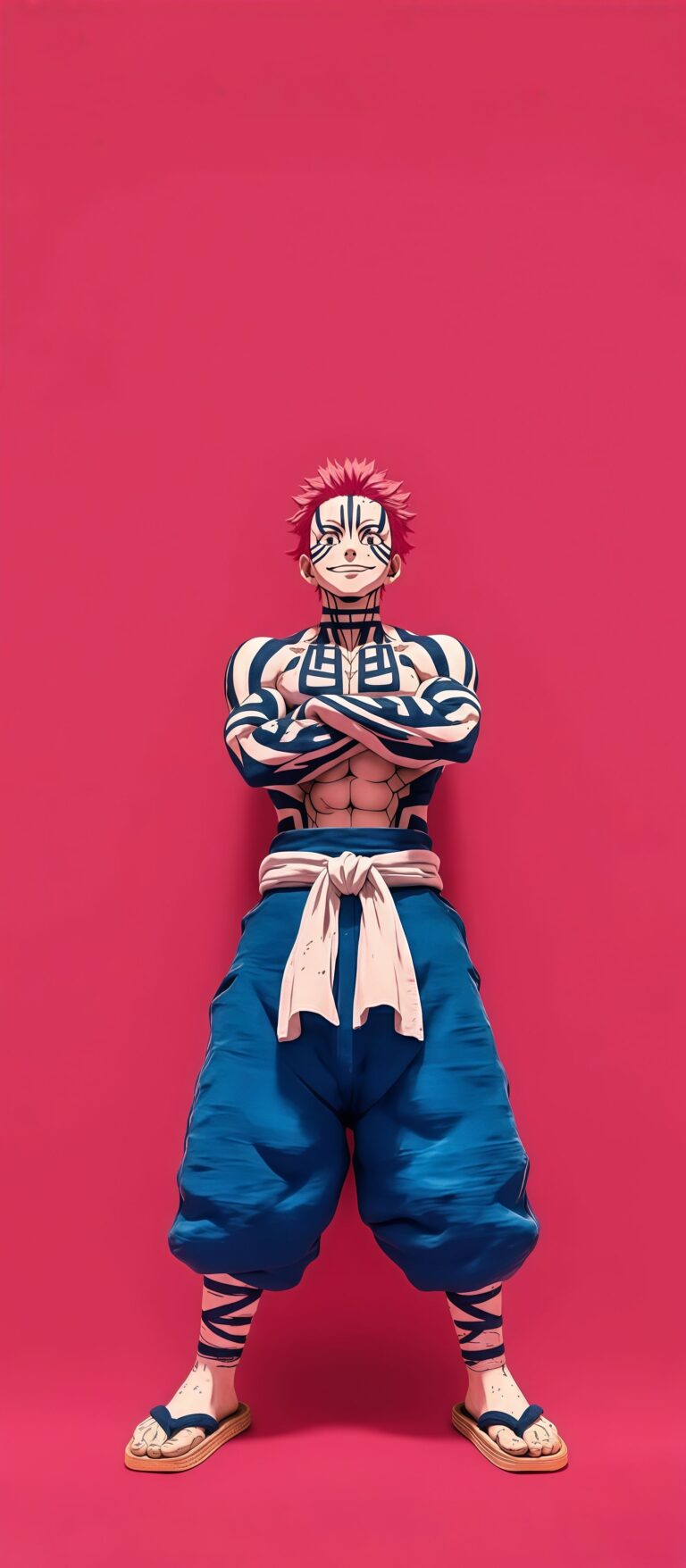 The Upper Rank Three Akaza Demon Slayer Anime Wallpaper features a striking, full-body portrait of Akaza, the powerful Upper Rank Three demon from the legendary series Demon Slayer: Kimetsu no Yaiba. Akaza is instantly recognizable by his intense facial expressions, characteristic body tattoos, and muscular physique, standing with his arms crossed in a pose of absolute confidence. He wears light-colored pants and a white sash, which contrast sharply against the bold, vibrant pink/magenta background. This intense anime wallpaper is perfect for fans of Demon Slayer and its formidable antagonists.