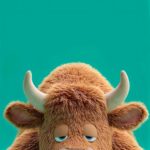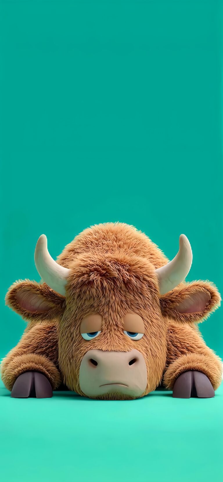 The Funny Fluffy Sad Cartoon Bull Plushie Wallpaper is a humorous and instantly endearing piece of 3D art. It features a soft, textured, fluffy brown bull with small horns, resting its heavy head and sporting a distinctly sad, pouty expression. The simple, vibrant teal/turquoise background makes the character pop, highlighting its sweet, sorrowful face. This cute, charming wallpaper is perfect for adding a touch of whimsy and playful empathy to your device.