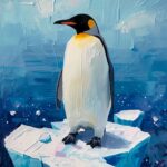 The stunning Emperor Penguin Arctic Impressionist Wallpaper features a majestic Emperor Penguin standing proudly on large chunks of icy blue and white ice. Rendered in a dynamic, textured style resembling an impasto oil painting, the backdrop is a dramatic blend of white and various shades of blue. This beautiful art wallpaper captures the serene yet harsh beauty of the Arctic environment.