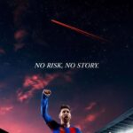 The Legendary Lionel Messi “No Risk, No Story” Victory Wallpaper showcases an iconic moment of triumph, capturing football superstar Lionel Messi in his classic FC Barcelona kit, celebrating victory while being held high by ecstatic fans. The dramatic backdrop features a stunning blend of a fiery sunset over the stadium lights, transitioning into a vast, starry night sky with a subtle contrail. The powerful, motivational quote “NO RISK, NO STORY.” serves as a core theme, making this a perfect inspiration for athletes and dreamers. This high-quality, vertical-format wallpaper is ideal for phone backgrounds.