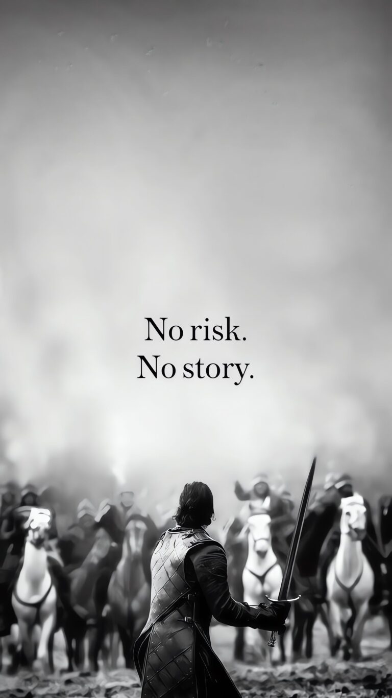 The Motivational No Risk No Story Game of Thrones Wallpaper is a stark and inspiring visual combining a powerful message with a dramatic scene. The motivational quote, “No risk. No story.”, is centered in the upper frame. Below Jon Snow in warrior armor, stands ready with a sword, facing an army on horseback in a black and white battlefield setting. The monochromatic scheme and misty atmosphere enhance the epic feel, making it a great motivational wallpaper for personal drive and courage.