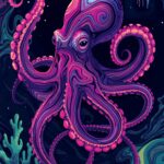 Dive into a surreal world with the Neon Psychedelic Octopus Underwater Wallpaper. This captivating piece features a highly stylized octopus rendered in vibrant, glowing purple and pink neon colors, surrounded by jellyfish, coral, and dark, swirling water elements. The dramatic, cosmic-like atmosphere of this artistic wallpaper is truly mesmerizing and unique.