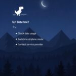 The Pixelated “No Internet” Dino Game Night Sky Wallpaper is a charming and humorous take on a common digital annoyance. It features the instantly recognizable 8-bit T-Rex from the Google Chrome “No Internet” Dinosaur Game screen, set against a stunning, flat-design illustration of a dark blue, starry night sky with shadowed pine tree forests and mountains and a bright crescent moon. The displayed “Try” suggestions (Check data usage, Switch to airplane mode, Contact service provider) are the practical ones. This fun and simple wallpaper is a great background for tech-savvy users.