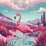 The Vibrant Pink Flamingo Desert Stylized Art Wallpaper is a stunning, high-saturation illustration of a serene yet surreal desert landscape. A tall, graceful pink flamingo stands as the central figure next to a tranquil pool of water. The color palette is intensely vibrant, dominated by bold pinks in the foreground and majestic, fluffy clouds, contrasted with the teal sky and cool purples of the mountains. This artful wallpaper creates a dreamy, aesthetic vibe, perfect for anyone who loves vibrant colors and stylized nature scenes.