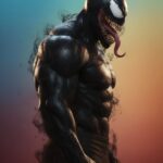 The Ferocious Black Symbiote Venom Muscular Power Wallpaper captures the raw, intimidating presence of the alien Symbiote. This wallpaper showcases a highly muscular and detailed Venom figure, shrouded in smoky darkness that adds to his menacing aura. The focus is on his classic features: the stark white eyes, razor-sharp teeth, and long, pink tongue. The vibrant gradient background provides an intense contrast to the dark, sinuous form of the anti-hero. A perfect Marvel choice for fans of the darker side of comics.