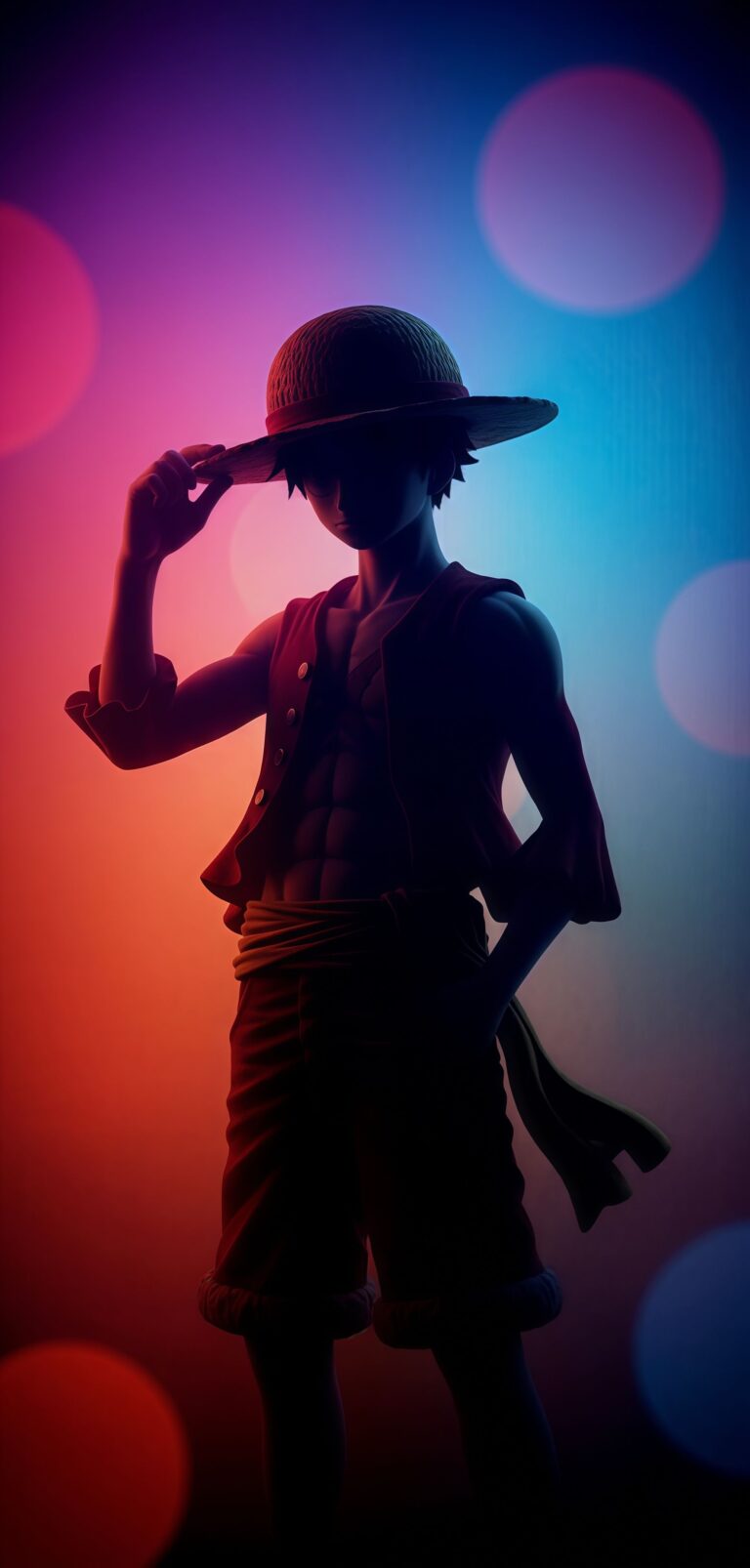 Monkey D. Luffy Straw Hat Silhouette Neon Wallpaper features the energetic captain of the Straw Hat Pirates, Monkey D. Luffy. This captivating silhouette shows Luffy in a confident pose, tipping his iconic straw hat, a symbol of his dream to become the King of the Pirates. The background is a stunning neon light gradient, shifting from rich reds and oranges to cool blues and pinks, overlaid with atmospheric bokeh lighting. This vibrant One Piece wallpaper perfectly reflects Luffy’s boundless ambition and fun-loving spirit.