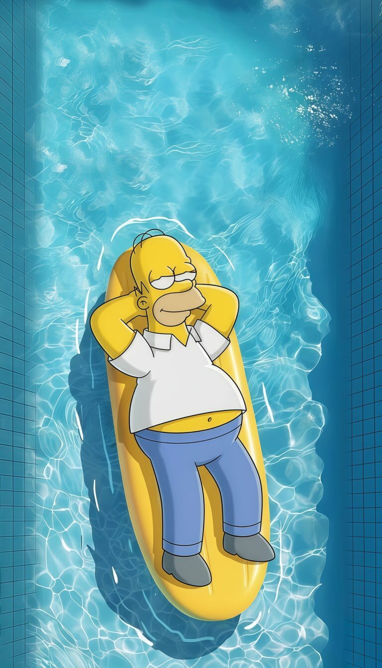 Homer Simpson Floating on a Pool Raft Wallpaper perfectly captures the relaxed—or perhaps lazy—spirit of Homer Simpson from the iconic show, The Simpsons. Homer is seen comfortably napping on a yellow inflatable mattress in a cool, blue swimming pool. Dressed in his typical white shirt and blue pants, he looks completely at ease. This funny, high-quality cartoon wallpaper is a great choice for fans of the show and adds a humorous, laid-back vibe to any device screen, suggesting a perfect, lazy summer afternoon.
