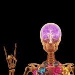 The Rock and Roll Floral Skeleton X-Ray Wallpaper is an excellent blend of edgy attitude and soft, vibrant beauty. This glowing golden skeleton proudly displays the “rock on” hand gesture. In contrast to the tough pose, the ribcage is filled with a lush, colorful bouquet of roses in bright pink, yellow, and blue, symbolizing a fiery, passionate heart. The skull contains a purple Tree of Life brain pattern, unifying the spirit with the style. This makes for a cool, duality-filled phone wallpaper. 🤘🌹