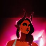 The Dispatch Malevola Confident Pose Red Skin Hero Wallpaper offers a closer look at the powerful red-skinned half-demon hero, Malevola, from the Dispatch Game. She is portrayed in a striking, confident pose, with her horns and fierce yellow eyes commanding attention. Her white tank top contrasts sharply with her red skin and the dramatic, glowing magenta light that backlights the scene. This vibrant wallpaper captures her assured and formidable personality.