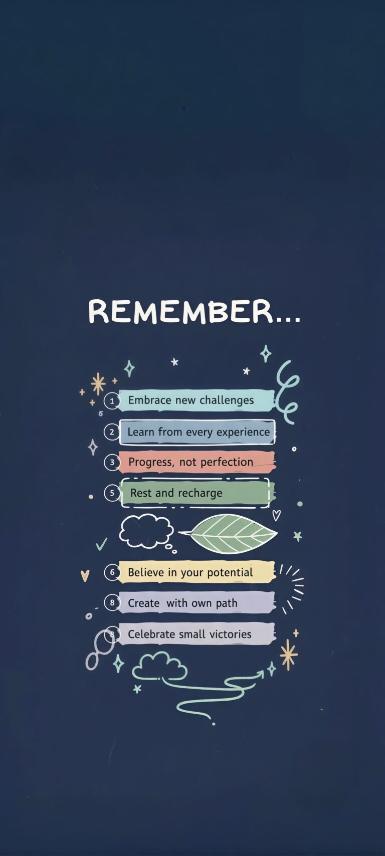 The Inspirational Remember Life Tips Wallpaper is a wonderful reminder to keep your focus and well-being in check. Set against a deep, soothing navy blue background, the word “REMEMBER…” anchors a list of essential life tips, each highlighted in a soft, pastel color block. The list encourages positive habits like embracing new challenges, learning from every experience, prioritizing progress over perfection, and celebrating small victories. Adorned with charming, hand-drawn sparkles and doodles, this motivational list wallpaper is the perfect daily boost to keep your spirits high and your mind focused on growth. Use this as your device background for a constant source of inspiration. 💖💡