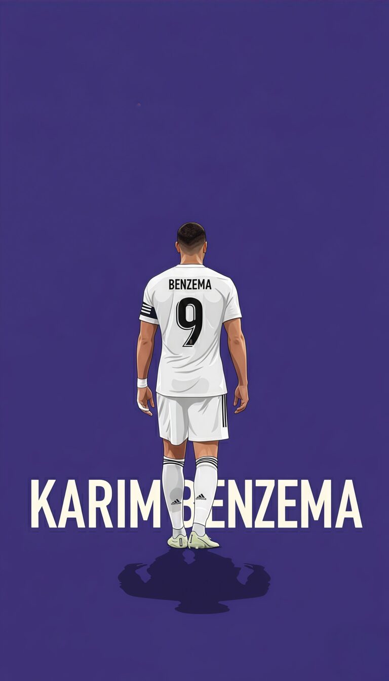Karim Benzema Real Madrid White Kit 9 Wallpaper is a sleek, modern tribute to one of Real Madrid’s greatest strikers, Karim Benzema. The image depicts the French forward wearing the classic all-white Real Madrid home kit with his prominent number 9. Set against a deep, vibrant purple backdrop, the design is both minimalist and powerful, highlighting the player’s formidable presence on the pitch. This high-resolution wallpaper celebrates the former captain and multiple Champions League winner, often referred to as ‘King Karim’. It’s an essential piece of mobile wallpaper for dedicated fans of the prolific goal-scorer. ⚪️🇫🇷