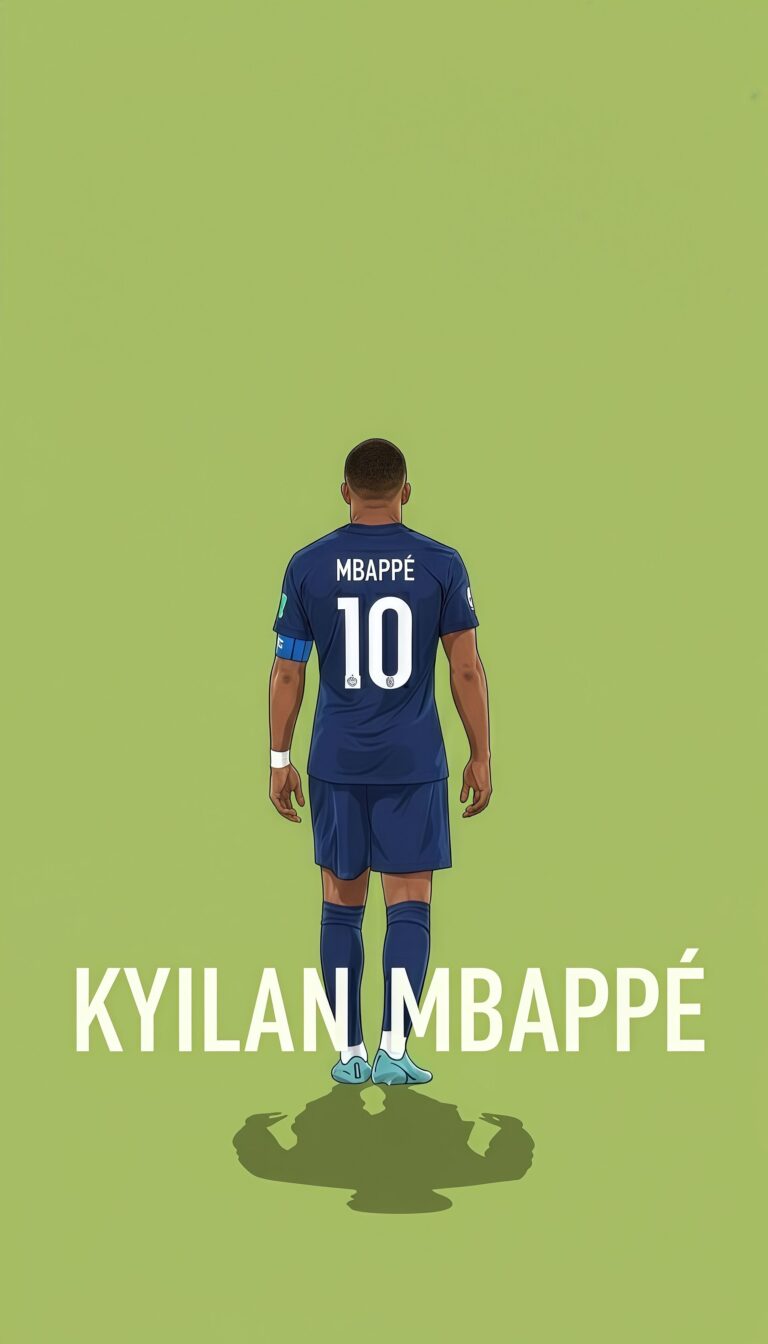 Kylian Mbappé France National Team Kit 10 Wonderkid Wallpaper captures the excitement and pace of one of the world’s best young players, Kylian Mbappé. The artwork shows the French superstar in the dark blue national team jersey, proudly wearing the number 10, typically reserved for playmakers and attacking leaders. Uniquely set against a vibrant olive green background, this stylish mobile wallpaper is a dynamic tribute to the World Cup winner and Paris Saint-Germain forward. It’s an excellent choice for fans of speed and explosive talent.