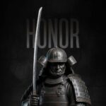 Samurai Warrior Honor Katana Wallpaper captures a powerful moment with a Samurai, clad in detailed armor and grasping his Katana, with the prominent text “HONOR” overlaying the dark, textured background. This detailed, bronze-hued phone wallpaper symbolizes the core virtue of the Samurai code, inspiring integrity and respect. Type: Japanese Warrior/Motivation