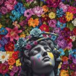 The Vibrant Color Splash Statue Floral Art Wallpaper captures an explosion of artistic expression. This striking digital artwork features a classically styled gray marble statue, whose serene expression is juxtaposed with the chaos of modern street art. He wears a subtle crown of blue and teal roses while streaks and splatters of high-key yellow, blue, and pink paint dramatically run down his neck and face, symbolizing a liberation of spirit and color. The backdrop is a densely packed tapestry of every possible flower—lilies, peonies, and various garden blooms in hyper-saturated shades of magenta, orange, blue, and violet. This wallpaper is a celebration of the beautiful collision between ancient form and contemporary, vibrant energy, making it an ideal choice for a dynamic and inspiring phone screen. 🌈💥