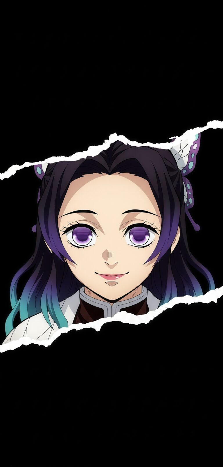 The Serene Shinobu Kocho Insect Hashira Purple Eyes Wallpaper showcases the elegant and deadly Insect Hashira. This striking wallpaper highlights Shinobu’s signature gentle, ever-present smile, which often conceals deeper emotions. Her beautiful black hair with purple and teal gradient tips, along with her butterfly hair ornament, are prominently featured. Her large, distinctive purple eyes stare directly out, adding an enigmatic quality to the image. Set against the stark black, torn background, this wallpaper perfectly captures her delicate appearance and lethal capabilities, making it a favorite among Demon Slayer fans.