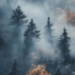 Moody Autumn Rain Forest Pine Trees Wallpaper captures the dramatic beauty of a forest during a cold, misty rain shower. The atmosphere is intensely moody, with thick fog and visible rain streaks dominating the scene. The color palette is predominantly a cool blue-grey and dark teal from the towering pine trees, which contrast strikingly with patches of warm, muted orange and yellow-brown foliage of autumn trees. This piece conveys a sense of quiet solitude and is a perfect dramatic and atmospheric wallpaper for your screen. Type: Digital Nature Art