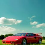 The Red Lamborghini Countach Classic Supercar Wallpaper perfectly captures the essence of a legendary vehicle. This striking red Lamborghini Countach, an icon of 80s supercar design, rests majestically in a sun-drenched, lush green field. The low-angle shot emphasizes its aggressive, angular design against the vivid blue sky with scattered white clouds. This high-quality, vibrant wallpaper is an absolute must-have for anyone who appreciates the history and raw power of classic Italian sports cars. What a brilliant, timeless shot!
