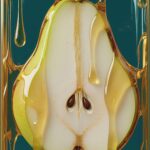 The Crisp Pear Slice and Golden Honey Drip Wallpaper is a striking piece of digital art. It features a meticulously detailed cross-section of a green pear, clearly showing the core, stem, and dark seeds. The entire slice is surrounded by and covered in a thick, golden-amber liquid that drips down the vertical composition, mimicking the look of rich honey or syrup. The contrasting deep teal background enhances the pale white and green of the pear, making it an excellent aesthetic wallpaper choice.