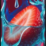The Vibrant Strawberry and Neon Blue Splash Wallpaper is a dynamic and high-contrast composition. A halved, bright red strawberry with visible seeds is dramatically suspended mid-splash in a vivid, glossy cyan/electric blue liquid. The background is a strong, complementary hot pink or magenta-red, creating a striking neon aesthetic. This piece is an edgy and energetic abstract wallpaper, perfect for users who love bold colors and food art.