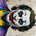 The Heath Ledger Joker Newspaper Collage Villain Wallpaper is a chilling and highly artistic rendition of Batman’s arch-nemesis, seemingly drawing inspiration from Heath Ledger’s memorable portrayal. The focus is on the villain’s unsettling face, characterized by messy makeup and a sinister grin, with the skin and some parts of the hair and clothing formed by the newspaper collage texture. The intense yellow eyes and the contrast of the bright, messy makeup against the predominantly brown/gray newspaper background make for a striking and slightly unsettling visual. This dark and expressive wallpaper is a fantastic pick for fans of the Clown Prince of Crime and classic comic villains. 🃏🤡