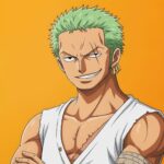 One Piece Roronoa Zoro Swordsman Wallpaper features the formidable swordsman of the Straw Hat Pirates, Roronoa Zoro, in a confident pose with his arms crossed, his signature green hair and three earrings prominent. His determined grin and scarred chest are on full display, highlighting his strength and resolve to become the world’s greatest swordsman. The vibrant orange background makes this a bold and eye-catching vertical wallpaper for any fan. His swords, the Wado Ichimonji and others, are visible at the bottom. This is a great wallpaper showcasing the classic One Piece art style. 💪🔥