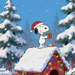 The Snoopy and Woodstock Decorating Christmas Tree Wallpaper is a sweet and light-hearted scene featuring the two best friends. Snoopy, wearing his Santa hat, sits below a red barrel that is wrapped in Christmas lights, carefully attending to a cookie or treat. Meanwhile, his little bird friend, Woodstock, is atop the barrel, which holds a small, brightly decorated Christmas tree. The whole charming scene is set against a cheerful light blue backdrop with gentle snow falling. This is a delightful and classic wallpaper for spreading easygoing holiday cheer. 🐶🐦