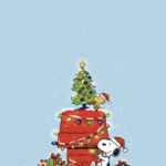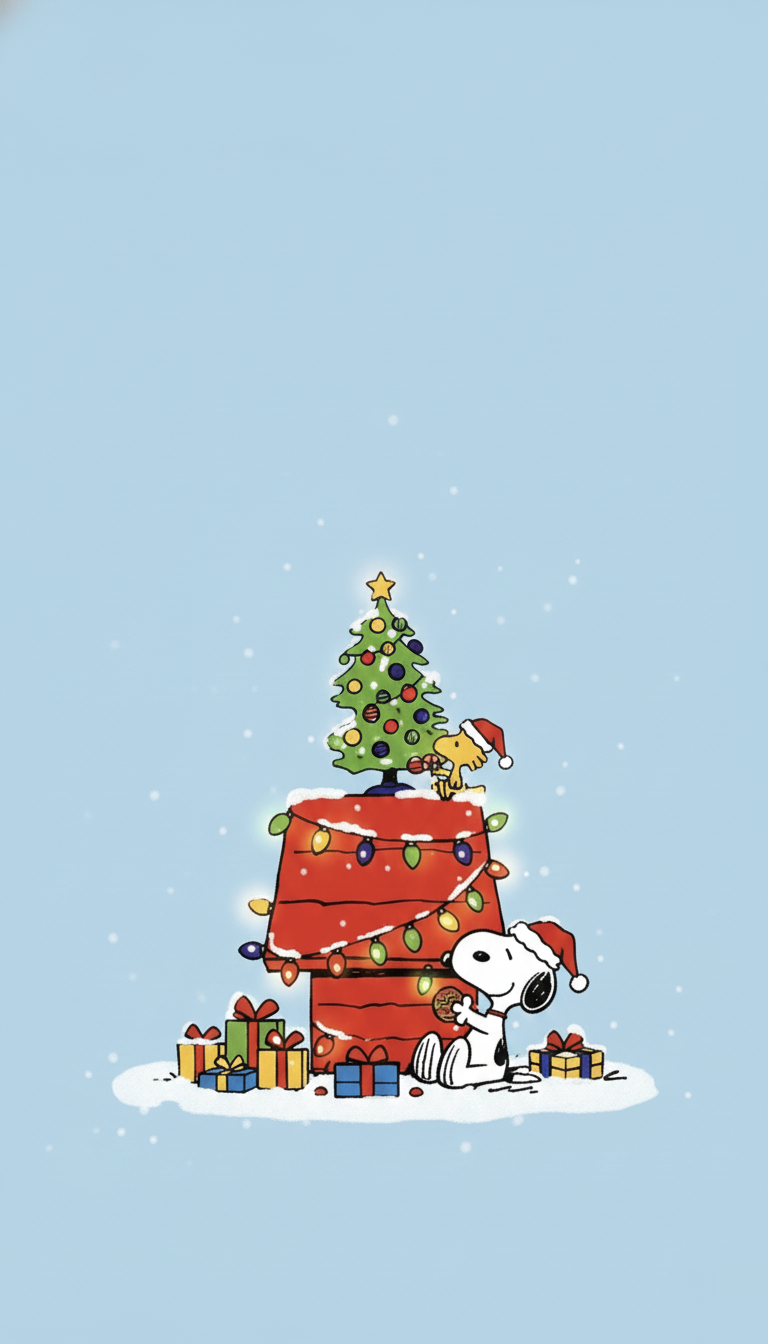 The Snoopy Christmas Red Doghouse Winter Wallpaper captures a perfectly charming moment from the world of Peanuts. Snoopy, the beloved beagle, is seen in a red Santa hat standing proudly on his iconic red doghouse, which is beautifully covered in snow and wrapped in bright, multi-colored Christmas lights. He is holding a small, wrapped gift, while a large sack of presents rests next to the house in the snowy forest setting. This heartwarming and nostalgic wallpaper is a must-have for fans of the Peanuts gang and brings a classic touch of Christmas to your screen. 🐾🎁