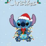 The Stitch Merry Christmas Wallpaper captures the mischievous Experiment 626, Stitch, spreading holiday cheer! He is featured wearing a classic Santa hat, wrapped up adorably in colorful Christmas string lights, and clutching a wrapped gift. The light blue background is dusted with white snowflakes, and the text wishes you “Mele Kalikimaka Merry Christmas,” which is Hawaiian for Merry Christmas. This sweet and vibrant image is the perfect wallpaper for anyone looking to bring a touch of tropical Disney magic to their device during the winter season. It’s an ideal choice for fans of Lilo & Stitch. 🎁💙