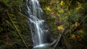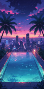 This stunning nighttime cityscape wallpaper features a modern city skyline with a train traveling along a canal. Viewed from an elevated angle, the city lights shine brightly as the sky transitions from twilight blues to vibrant oranges, hinting at a beautiful sunset. Streaks of light in the sky capture the last moments of daylight. The train is meticulously detailed, adding motion and life to this serene yet dynamic urban scene. Ideal for those who appreciate the beauty of city life, transportation, and vibrant sunsets.