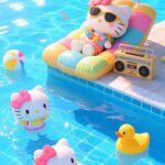 The Hello Kitty Summer Pool Party Live Wallpaper is an adorable, bright scene featuring Hello Kitty and friends enjoying a sunny day by the pool. The main figure lounges on a colorful inflatable chair, wearing sunglasses and listening to music, while a couple of other Hello Kitty figures and a rubber duck float in the sparkling blue water. This cheerful and vibrant animated wallpaper brings a touch of kawaii summer joy to your screen.