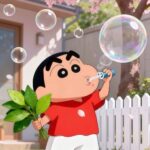 Shin-chan Cherry Blossom Blowing Bubbles Live Wallpaper captures the mischievous boy from Crayon Shin-chan in a beautiful springtime outdoor scene. The live wallpaper features Shin-chan, dressed in his classic red shirt and white shorts, standing in a sunlit garden beneath a stunning pink cherry blossom tree, holding a bouquet of green leaves. The animation shows him playfully blowing large, iridescent bubbles that gently float and pop around him, with cherry blossom petals slowly falling. This bright and cheerful animated background perfectly combines the charm of the beloved character with a fresh, vibrant, and moving spring aesthetic.