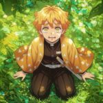 Zenitsu Agatsuma Nature Live Wallpaper showcases the electric Demon Slayer, Zenitsu, looking startled while kneeling in a brilliant green, flower-filled forest. His vibrant yellow-to-orange haori and signature hairstyle contrast beautifully with the sun-drenched foliage. Despite his expression of panic, the overall effect is a stunning and memorable live wallpaper for any fan. ⚡️💛